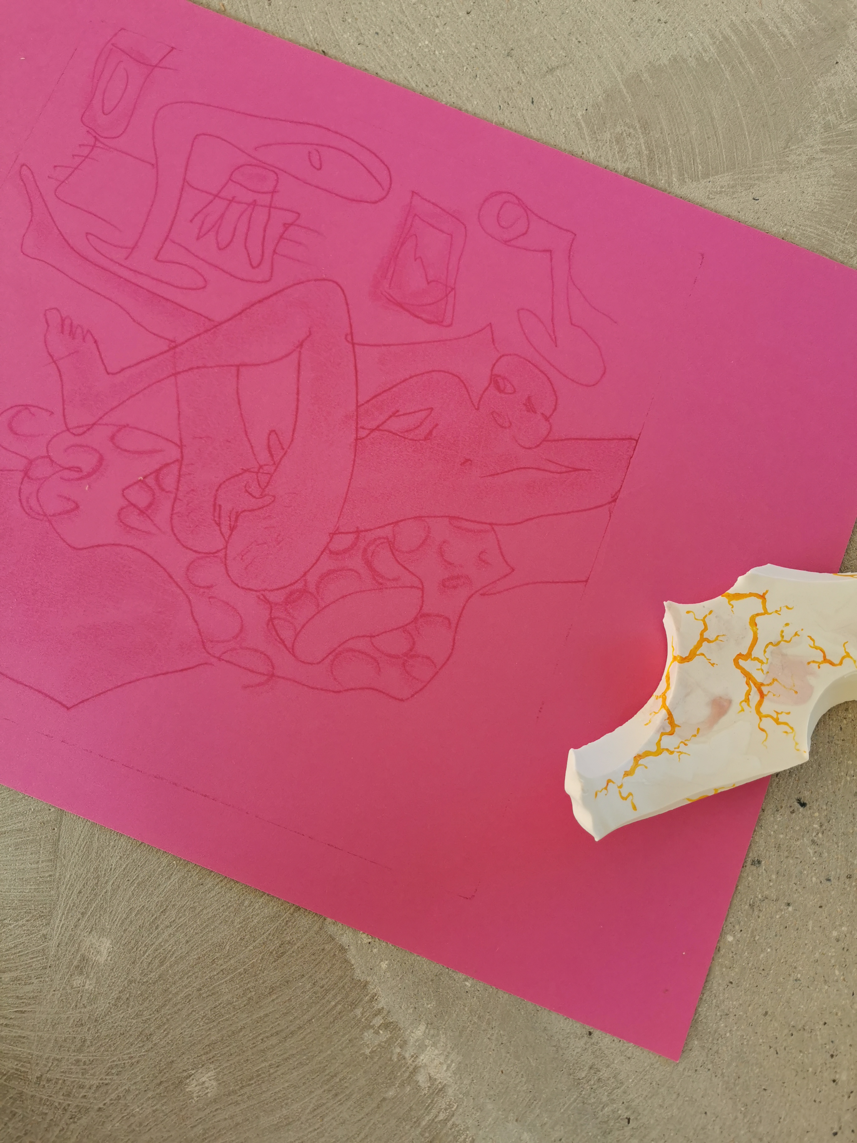 Oil paint on porcelain, velvet, steel, silver, monotypes on paper, UV-print on perspecs, leather jewelery bag, pencil drawing.